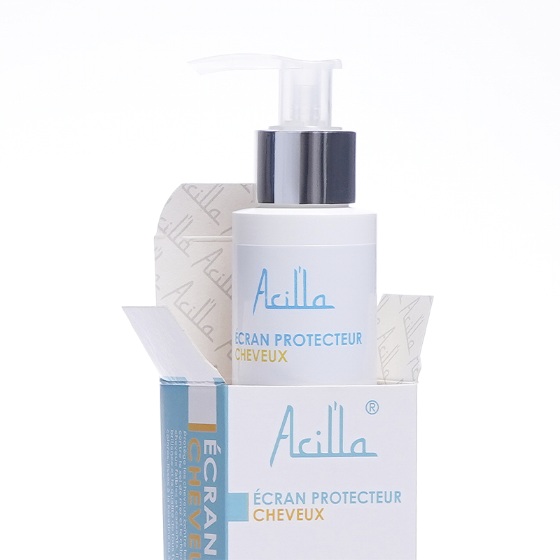 L'Écran Protecteur Cheveux SPF 50 d'Acilla protège vos cheveux contre les rayons UVA et UVB, le sel de mer et le chlore. Hydrate et préserve la brillance et la force des cheveux, convient à tous types de cheveux, y compris colorés et lissés.