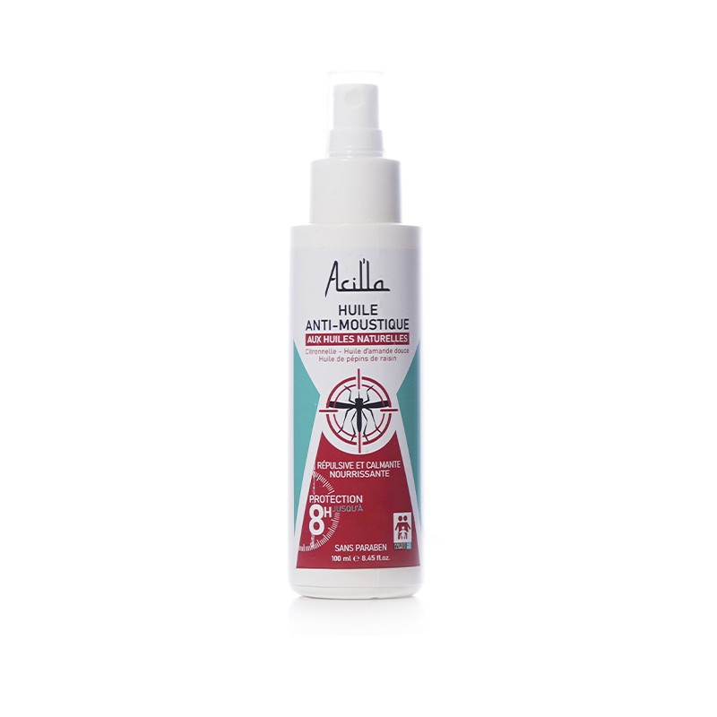 L'Huile Anti-Moustique Acilla est formulée avec de la citronnelle, de l'huile d'amande douce et de l'huile de pépins de raisin. Sans paraben, elle protège la peau des piqûres d’insectes tout en apaisant et calmant les irritations.